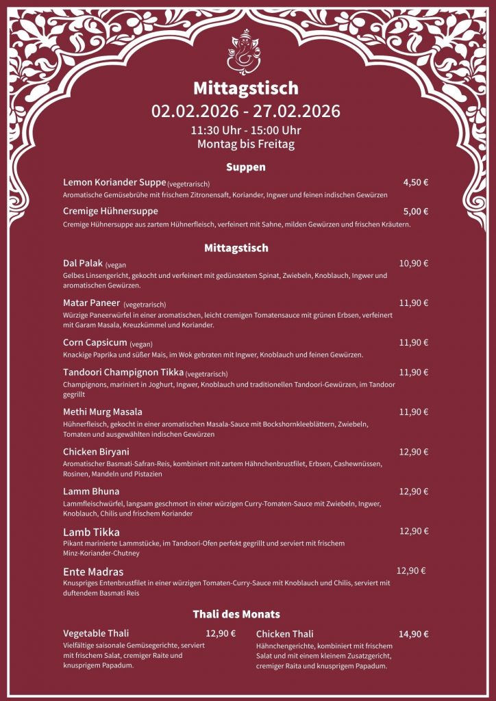 Freuen Sie sich auf Abwechslung und Vielfalt: Unser Mittagstisch wird jeden Monat mit neuen, frisch zubereiteten Gerichten für Sie zusammengestellt. Entdecken Sie immer wieder neue Spezialitäten der indischen Küche und genießen Sie eine köstliche Pause mitten am Tag.