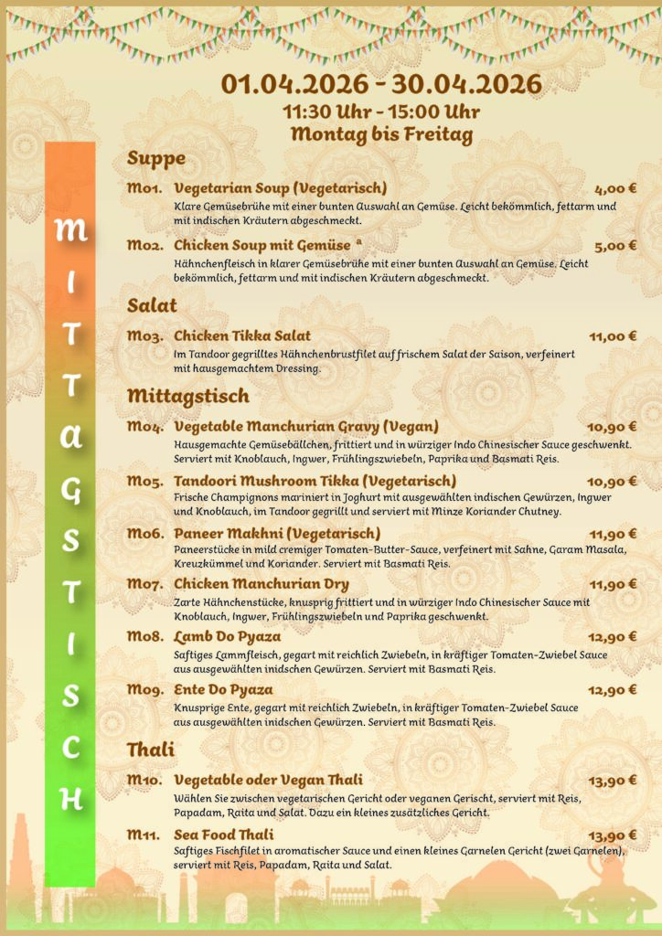 Von Montag bis Freitag zwischen 11:30 und 15:00 Uhr servieren wir Ihnen täglich frisch zubereitete indische Spezialitäten. Jeden Monat erwarten Sie neue Gerichte voller Geschmack und Abwechslung